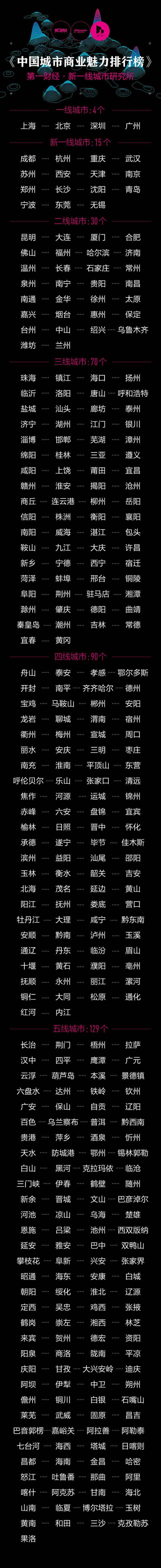 依据最新一年的170个品牌商业数据、19家互联网公司的用户行为数据及数据机构的城市大数据,第一财经·新一线城市研究所对中国338个地级以上城市再次排名。