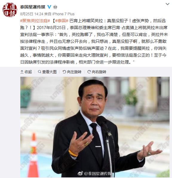 据泰国星暹传媒官微报道,巴育在25日当天就英拉未出席宣判法庭一事表示:“首先,英拉跑哪了,我也不清楚,但是可以肯定,英拉并未按法律程序走,并且也无意公开去向,我只想说,真是没胆子啊,就那么不勇敢面对宣判?吸引民众同情虚张声势后销声匿迹?”
