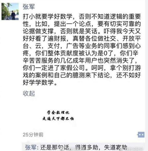 王帅表示,腾讯说半条命给了合作伙伴,但腾讯整条命却都是小学生给的。腾讯公关总监张军随后回应称,打小就要学好数学,否则不知道逻辑的重要性,要有切实可靠的论据做支撑,否则就是笑话。