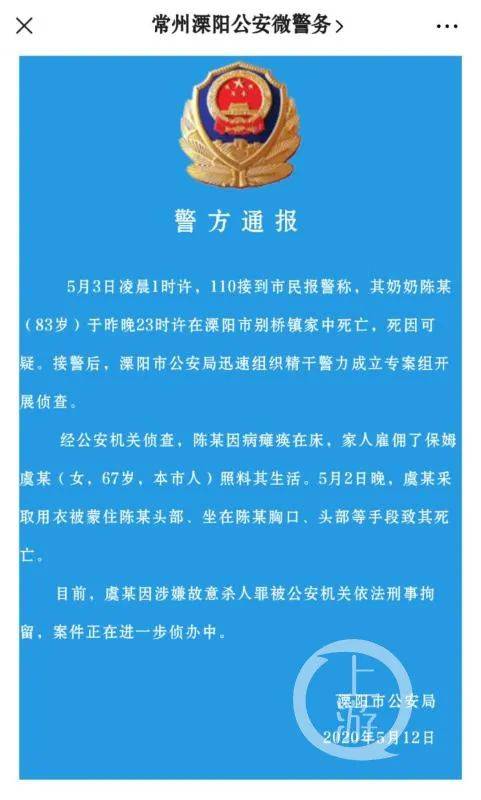 5月2日,江苏省常州溧阳市发生一起保姆闷死83岁老人案件,案件曝光后引发广泛关注。
