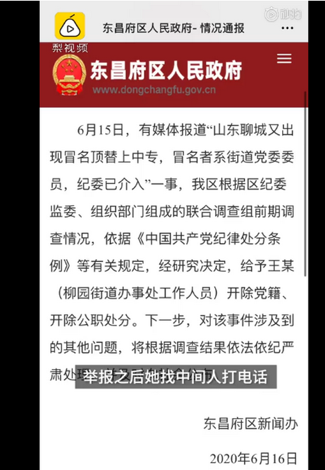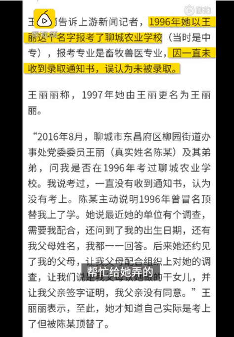 山东聊城的王丽丽(曾用名王丽)在1996年考取聊城农业学校,后被人顶替。现顶替者已被开除當籍、开除公职。6月17日,@紧急呼叫从顶替者王丽同事处获悉,其系该街道办當委委员负责组织工作(副科级)。其同事称,王丽已被撤职得到应有的处分,但现在两败俱伤,双方应提前协调。
