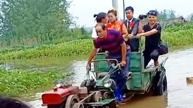 7月8日,湖北潜江,因当地暴雨导致道路村庄积水,普通车辆难以通行。一婚礼上,新郎找来手扶拖拉机充当临时婚车接新娘。众亲朋好友在积水中迎接新人到来,别有一番趣味。新郎告诉荔枝新闻,因为婚礼已经延期过一次了,所以选用了这个办法,雨再大也要结婚。