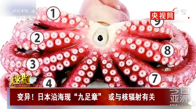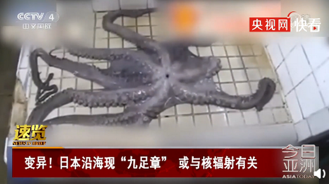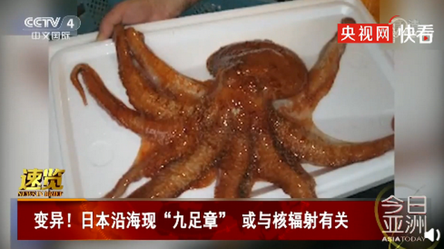 近日,日本宫城县沿海村子出现一只有9个触手的章鱼。发现它的渔夫表示,这是平生第一次看到这种章鱼,随后报告村里的自然保护机构。专家鉴定后提醒渔民要小心,因为村子距离福岛核电站所在地很近,不排除这种动物变异与辐射有关。