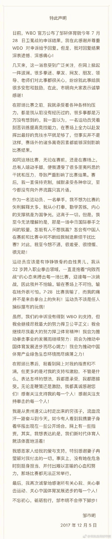 今年7月28日,邹市明在WBO拳王金腰带卫冕战中第十一回合被木村翔击败。赛后邹市明及妻子曾前往洛杉矶向WBO上诉,提出这场比赛在过程中有诸多细节不符合规范,希望推翻邹市明被TKO的结果,并要求与木村翔重赛。WBO官方于9月18日和11月21日对邹市明所属的邹轩体育提出的上诉进行了驳回。5日上午,邹市明在其本人微博发表了声明,声明中称自己对WBO官方给予的回复“深表遗憾、深感痛心”,并自曝自己在这次比赛中承受的前所未有的压力。在声明的最后邹市明对关心自己、关系中国体育发展的人表示了感谢,并称自己将不忘初心,砥砺前行。