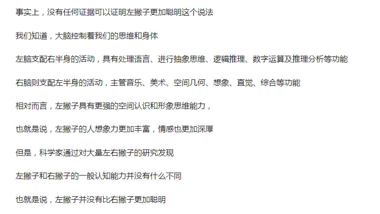 如果说左撇子的人记忆力特别好,那跟右手的人比一比吧,现在大家知道的记忆力好的人,有几个是左撇子?大部分不还是习惯右手的人嘛,左撇子一定也有在某些领域比较强的人,但这更是其他因素决定的,尤其是记忆力,跟左右手关系不大,说起来,还是大脑管着记忆的,跟惯用左右手有什么直接关系呢,
