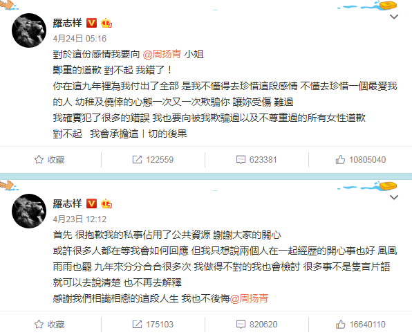可是短短一夜之后,罗志祥再次发声回应,并向周扬青郑重道歉,和他第一次发声回应的态度发生了极大的转变。 而且除了周扬青以外,罗志祥还表示向他曾经所有欺骗过以及不尊重的女性道歉。
