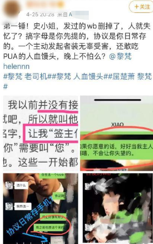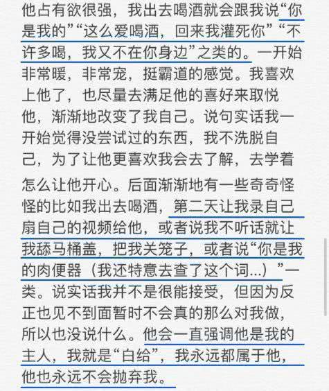 她写了长文透露屈楚萧有特殊癖好,曾用充电线在自己背上抽出一个“X”,还曾威胁自己舔马桶盖,把自己关进笼子里,强调两人间“主人”和“奴仆”的关系。因此很多人认为屈楚萧PUA了女方,随后屈楚萧也遭到了更多网友的声讨。