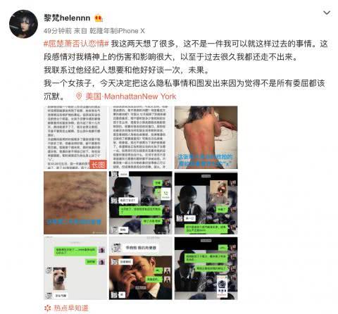 没想到随后出现一位名叫黎梵的女网友,自称曾在感情中受到屈楚萧欺骗,不仅恋爱期间劈腿其他人,而且还曾经给自己打了十几万当做封口费,不让自己曝光他私下的滥情事。但她所说的却遭到了很多网友的质疑,在和网友们纠缠几天后,这位黎梵终于曝光了自己曾经遭受过的事情。