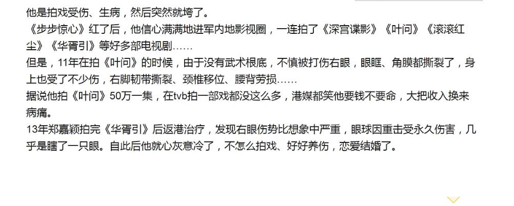 后来有媒体透露,原来是因为他在内地拍《叶问》的时候,因为意外弄伤了眼睛和韧带、颈椎等多个地方,在医院接受治疗之后,身体状况就急剧下降,而且颜值也崩塌了,还得到了港媒的嘲笑。